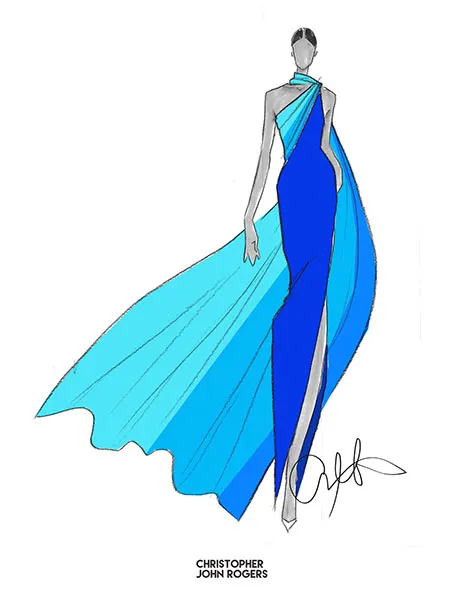 Christopher John Rogers con una creación personalizada de seda de cuatro capas